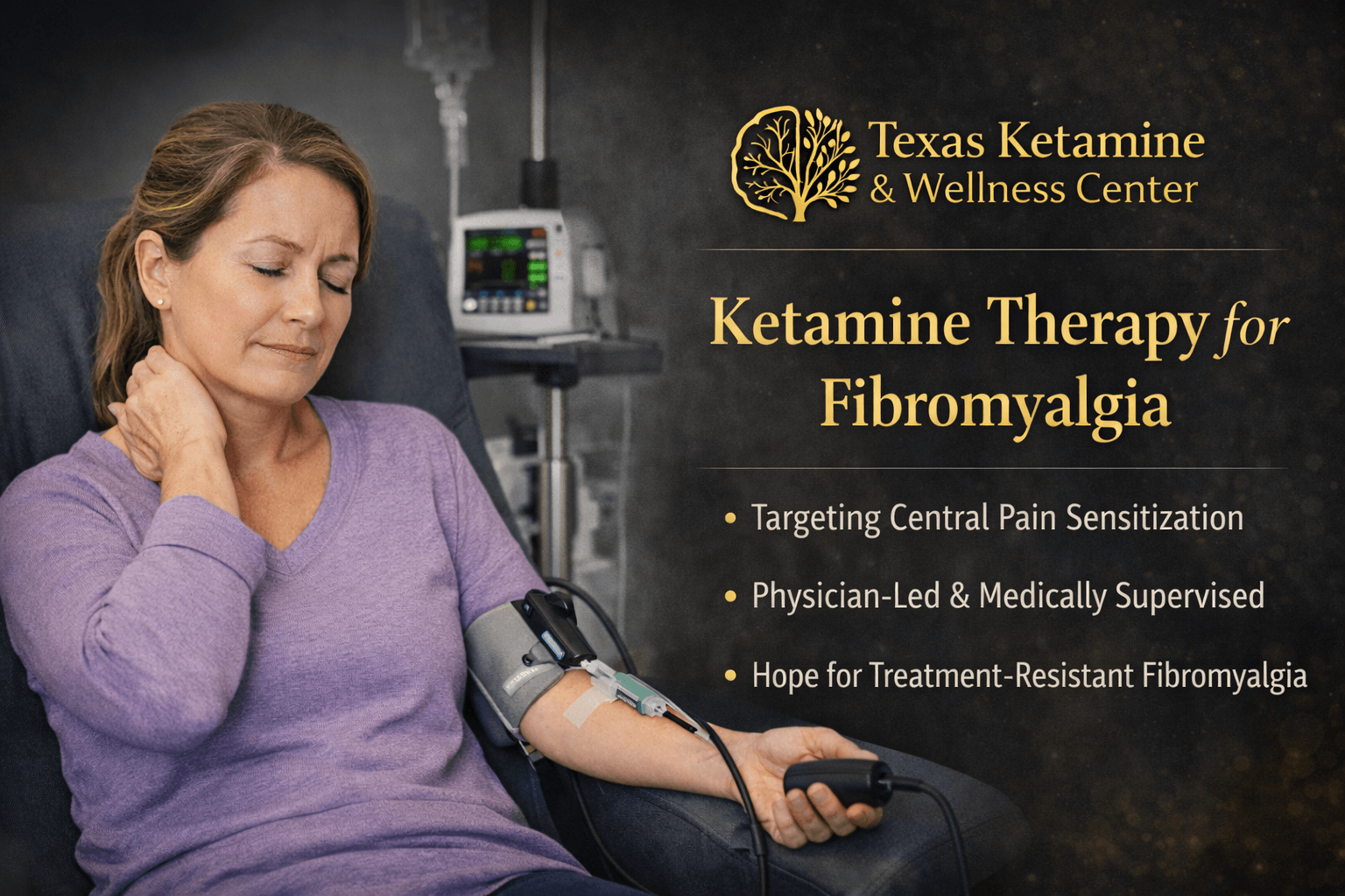 At Texas Ketamine & Wellness Center, we offer physician-led ketamine infusion therapy as a potential option for carefully selected patients with treatment-resistant fibromyalgia, particularly when symptoms suggest prominent central sensitization. Our approach emphasizes medical oversight, conservative dosing, and integration with comprehensive pain management care.